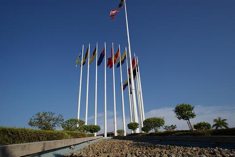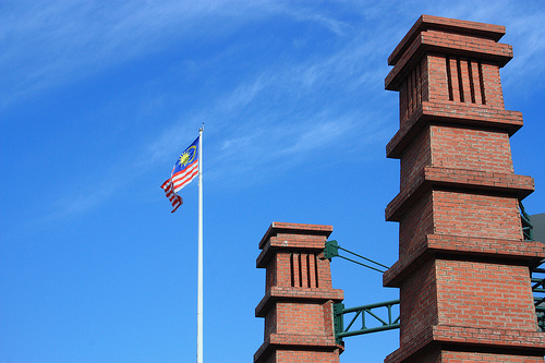 The central focuses a raised opened stage with flags of Malaysia flying on tall poles.